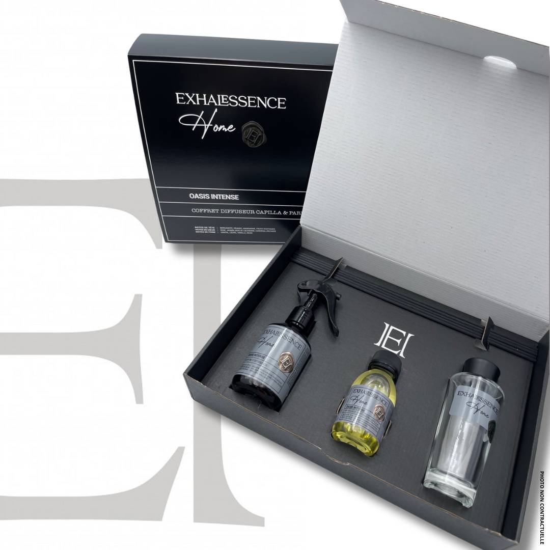 Nous avons le plaisir de vous annoncer le lancement de nos coffrets Exhalessence Home, spécialement conçus pour transformer votre intérieur en un havre de paix et de bien-être. Chaque coffret contient un diffuseur capilla 100ml rechargeable, une recharge de parfum Capilla 100ml, et un diffuseur d'ambiance 150ml.
